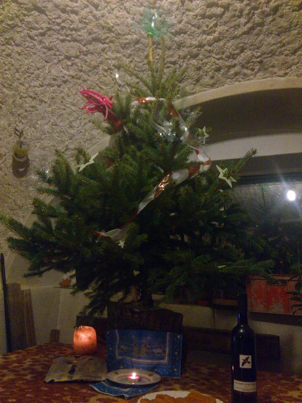 Jak řešíte otázku stromečku? Máte umělý? Kupujete si ho každý rok na rohu těch velkobarevných nemovitých placatokrabic? Navštěvujete 23.12.x o půlnoci s nenápadným hvízdotem a zubatým kusem železa nejbližší les...? My nezvolili ani jednu ze zmiňovaných možností. Původně jsme chtěli koupit stromeček v květináči, který bychom pak zasadili, ale už k tomu nedošlo a napadla nás ještě alternativnější ujetější varianta - dumpster diving: zajeli jsme si pro něj ke kontejnerům před paneláky, :D, čímž jsme jej zachránili před vyhozením.