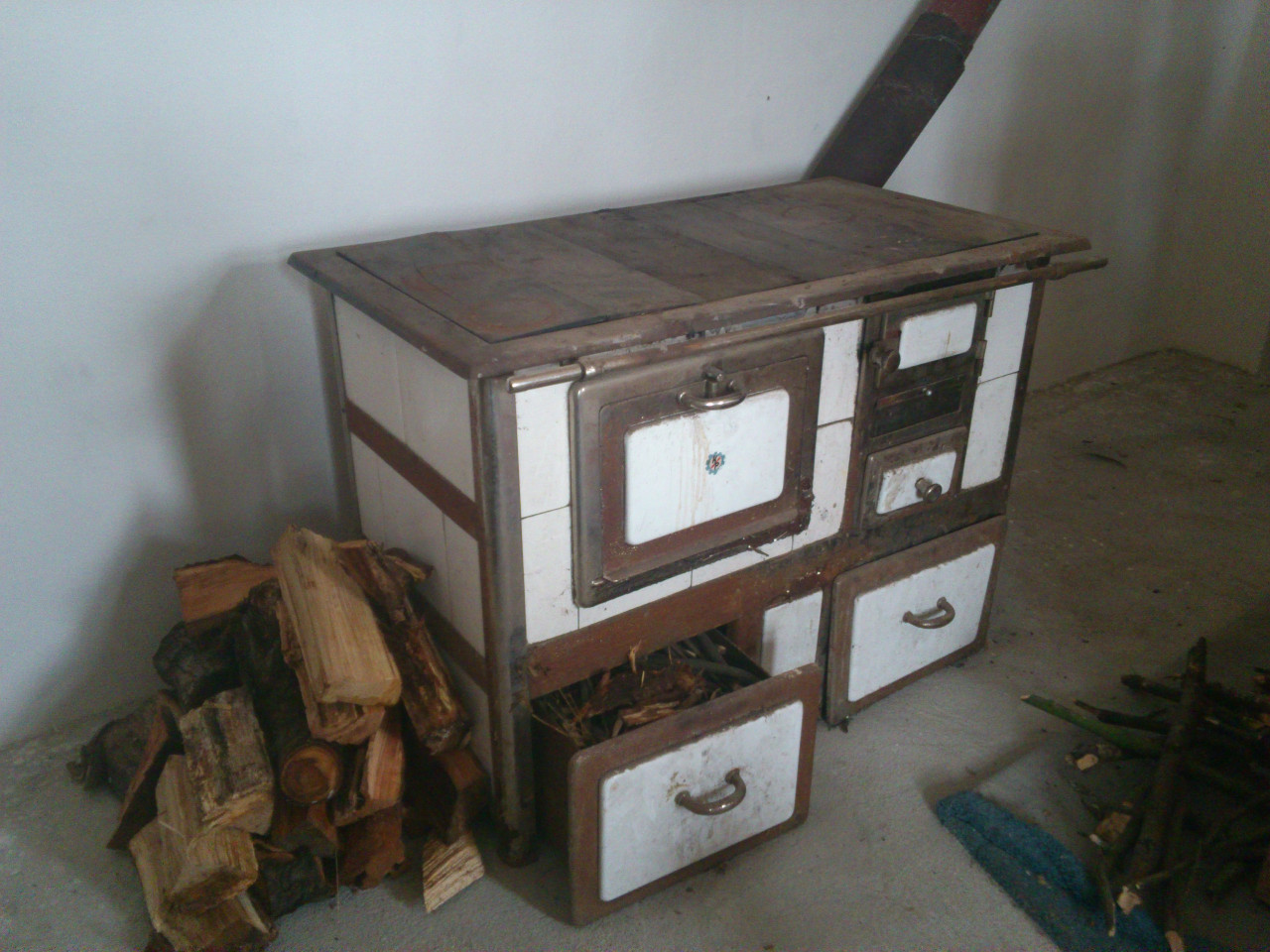 Podzim už je tady, zima se blíží... Nejen proto jsme se rozhodli přemístit nepoužívaná kamna z přední místnosti do jedné zadní (minulé léto vybílené), aby byla obyvatelná i přes zimu. Během transportace jsme využívali naše odborné znalosti načerpané během pozorování laterálního myšlení životem kvalifikovaných odborníků Pata a Mata z večerníčku "A je to". Kdyby to někdo natáčel, je na světě nová epizoda, ale s jedním významným rozdílem - nám se v průběhu té zábavné improvizace naštěstí nic nepokazilo, zvládli jsme to jako dobře sehraný tým. Během toho jsme používali třeba otrhané lino (původně určené k recyklaci), vozík, dřevěnou rampu, plech... A o něco později jsme kamna instalovali za pomocí okapové roury, roztopili a ohřáli v pícce první jídlo.